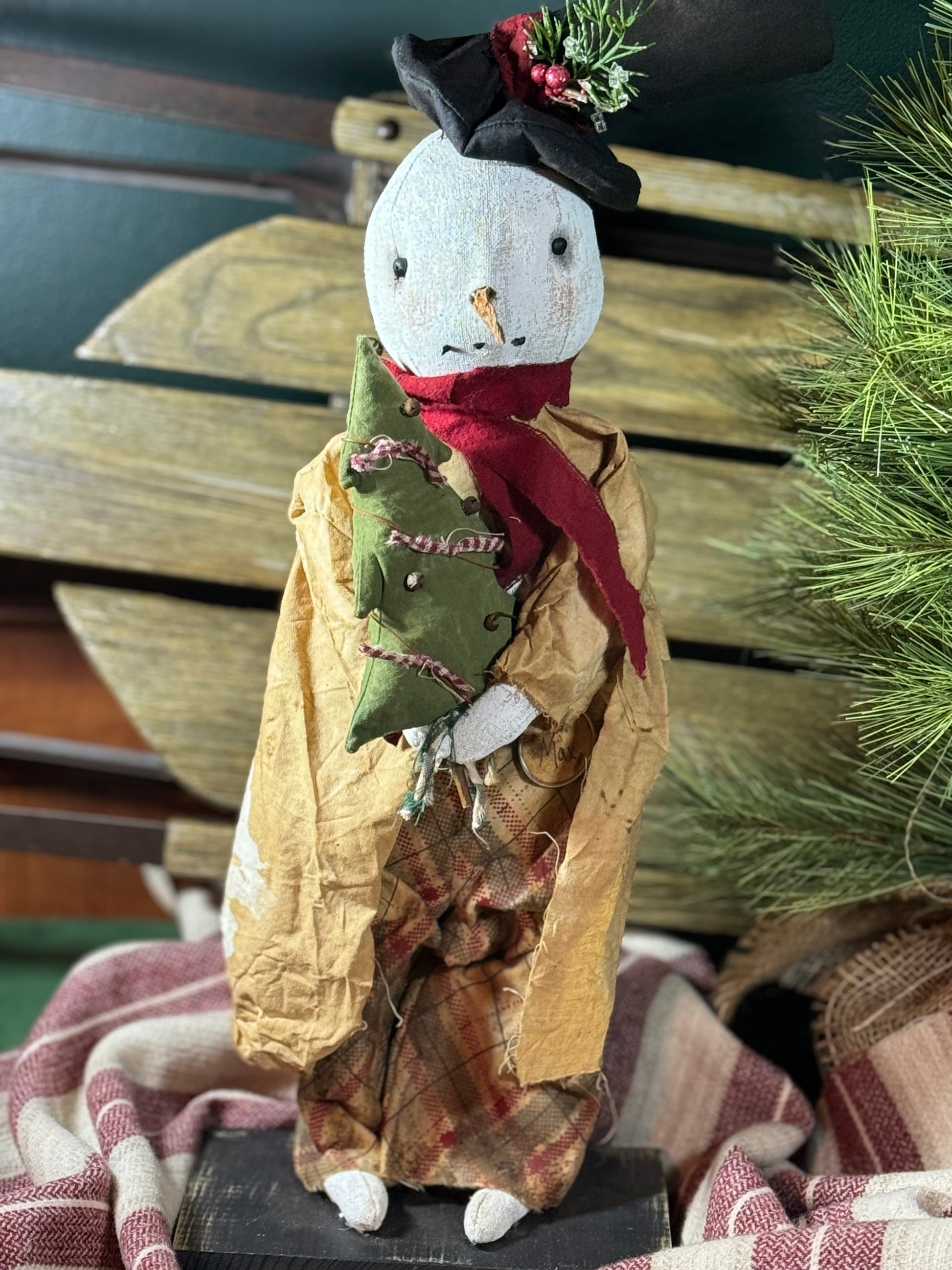 Max is snowman that is dressed in his best for the holidays. Wearing his top hat, coat, and plaid pants. He carries a Christmas tree, which is decorated with a homespun ribbon, rusty bells, and safety pins. Max is 17" tall to the top of his head.